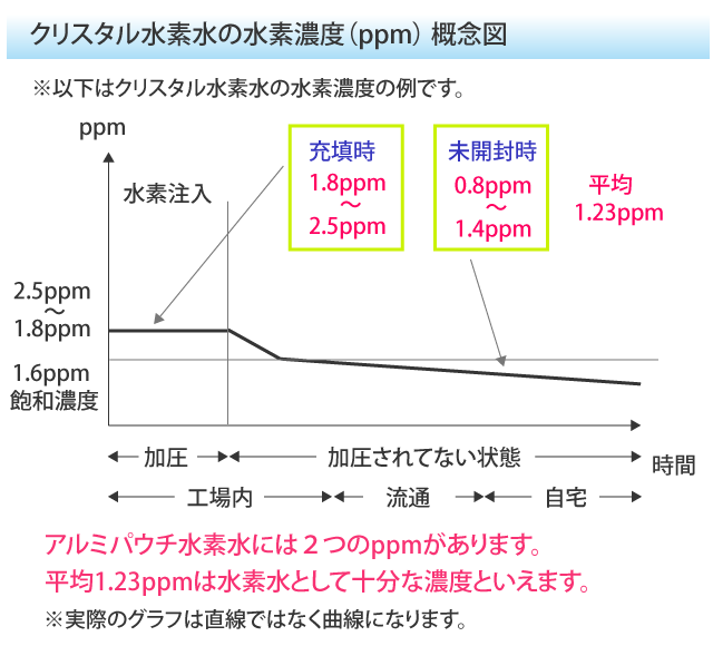 クリスタル水素水の濃度は商品出荷時の濃度は1.8~2.5ppm。商品到着直後の未開封時の濃度は0.8~1.4ppm。未開封時の濃度は平均1.23ppmあります。