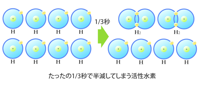 活性水素の半減期は約1/3秒=0.33秒と言われています。そのため、0.66秒後には1/4に、約1秒後には1/8になってしまいます。