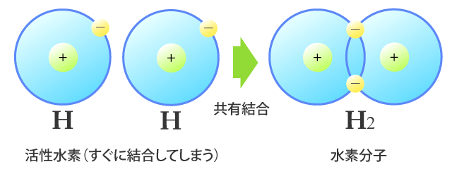 そのため、「H2」は電子構造についてはヘリウムと同じ形を形成するので、「H」と「H2」ではその働きは大きく違ってきます。