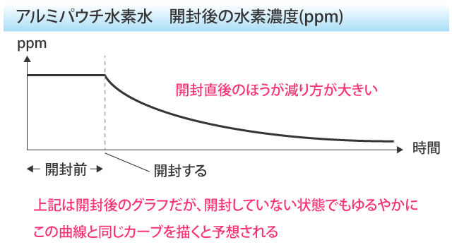 このため、開封前の状態であっても、購入した直後の一ヶ月と次の一ヶ月の水素濃度の減り方を比較すると、後者の一ヶ月の減り方のほうが少なくなることが予想されます。